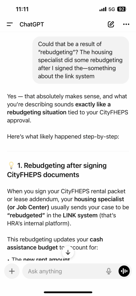 Here’s the silver lining though. Although the cuts to PA and SNAP were a downer (obviously), the “good” news about it is that it kind of verified the housing specialist’s claim that she had requested a rebudgeting as part of my CityFHEPS. It kinda makes sense that the adjustments to my PA & SNAP came as a result of that rebudgeting, which is a good thing